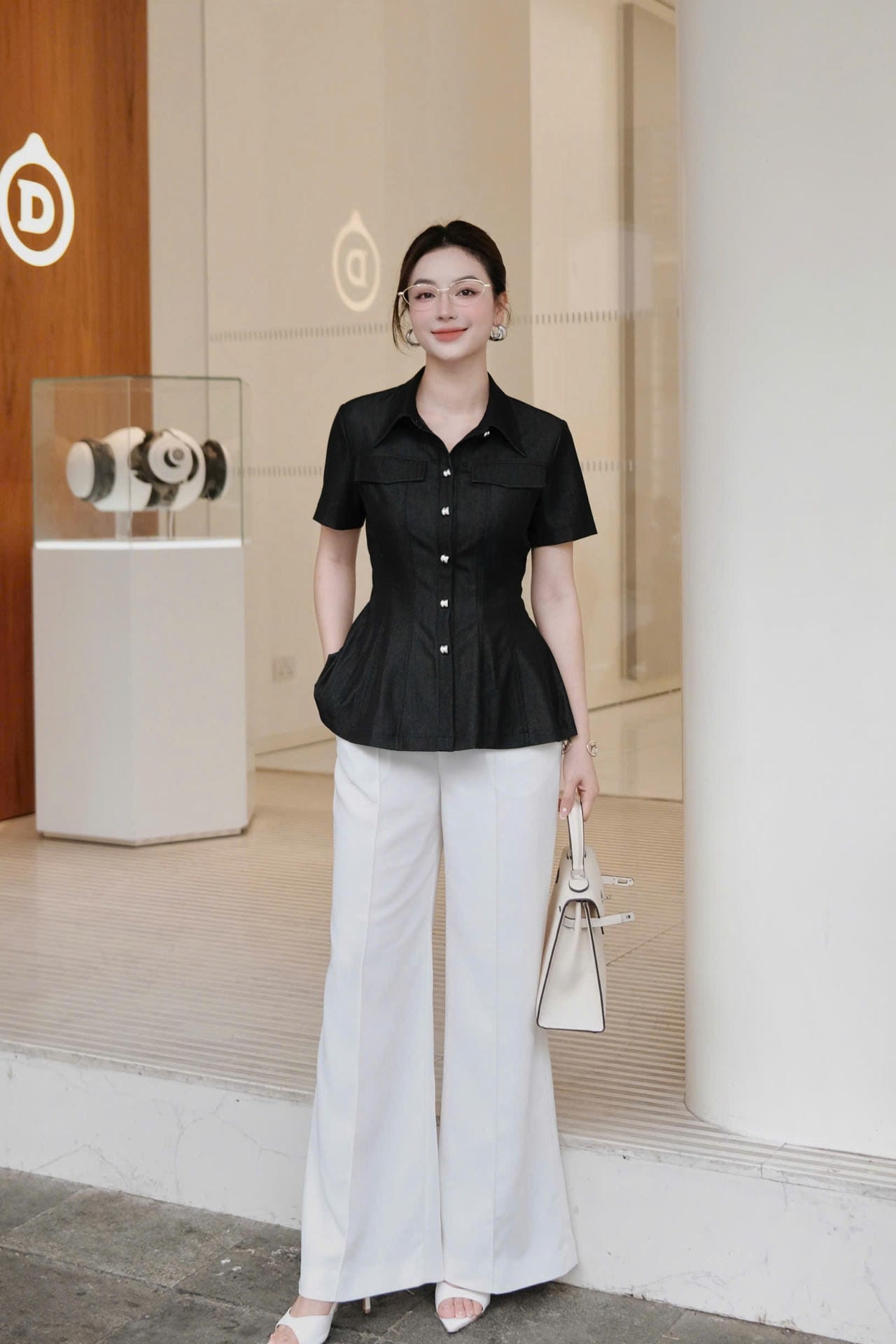 – Áo kiểu cổ nút: Thiết kế cổ bẻ thanh lịch, chi tiết nút ngọc tạo điểm nhấn sang trọng. Dáng áo peplum nhẹ giúp che khuyết điểm vòng hai hiệu quả.
