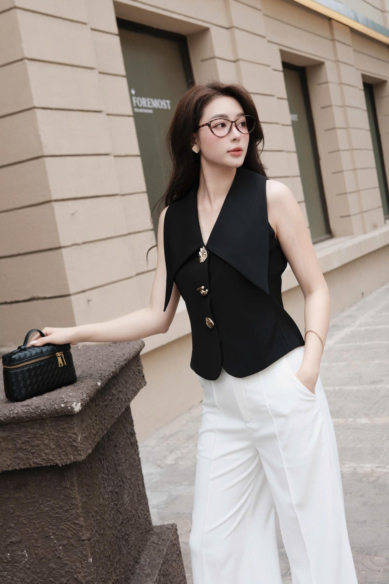 Áo Gile Đen Cổ Cánh Nhạn Phối Khuy Vàng Cách Điệu MACI by MKC MCAGLDE0107 Thời Trang Nữ Thiết Kế Độc Quyền