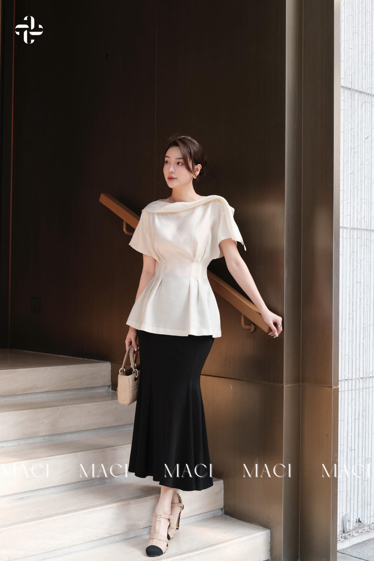 – Áo peplum trắng kem: Kiểu dáng cổ lệch độc đáo, tôn lên sự thanh lịch và mềm mại. Thiết kế eo chiết nhẹ giúp tạo vòng eo thon gọn, phần tà xòe vừa phải giúp tổng thể trang phục hài hòa.