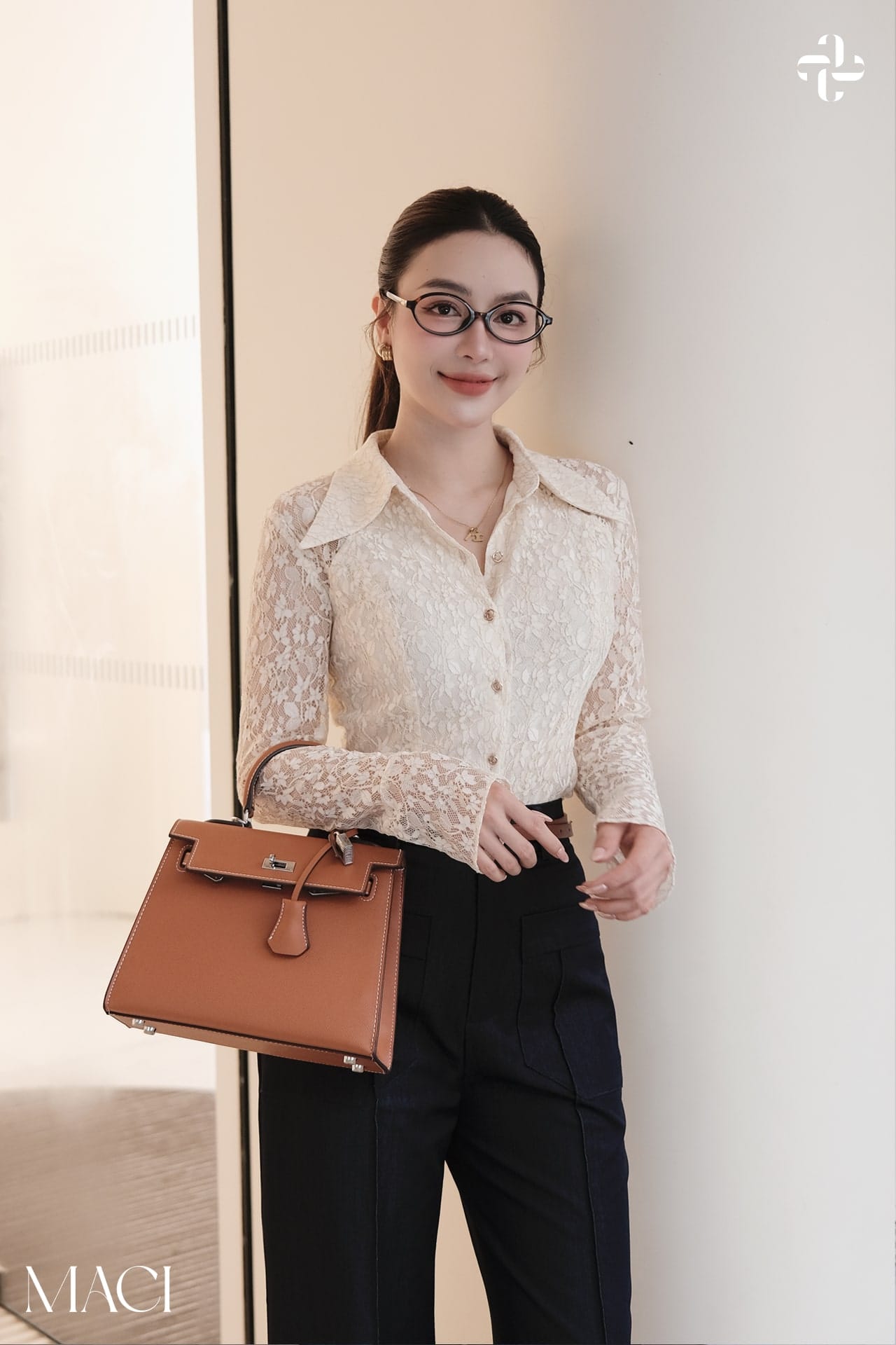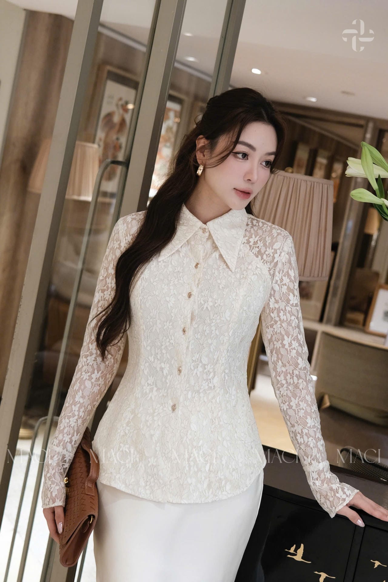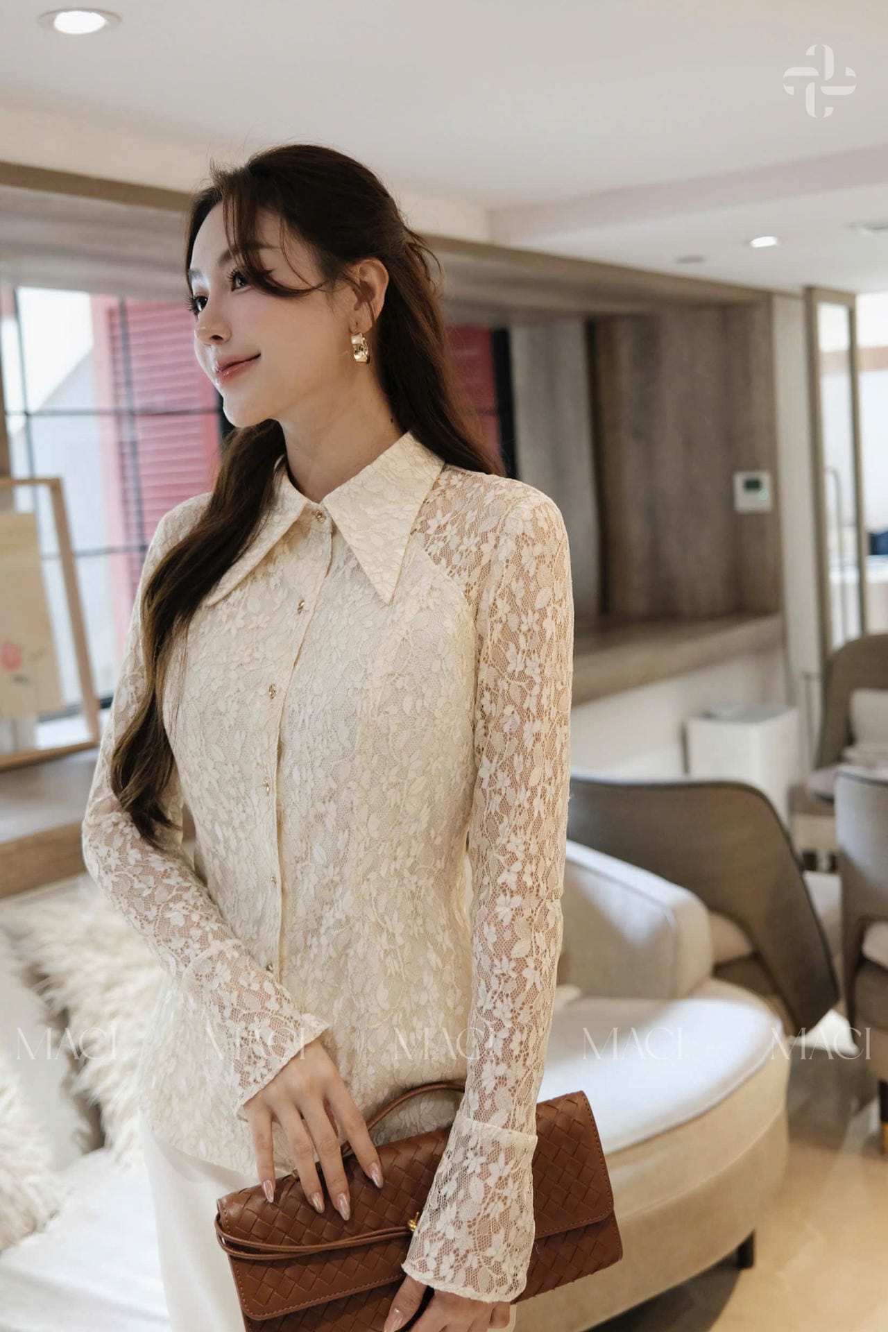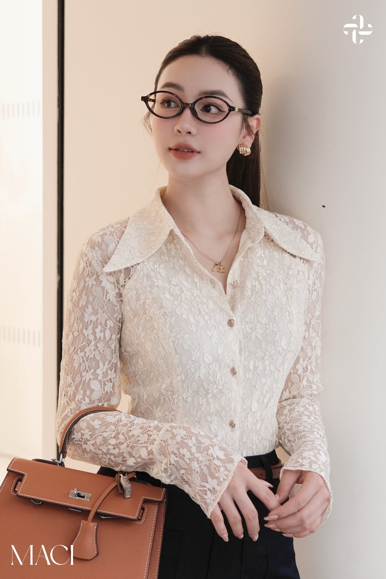 – Áo sơ mi ren dài tay với họa tiết hoa nổi sang trọng, nữ tính.