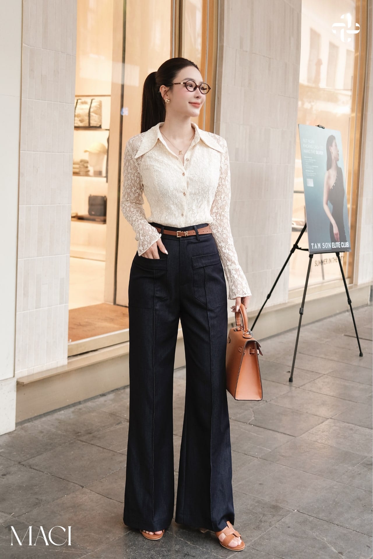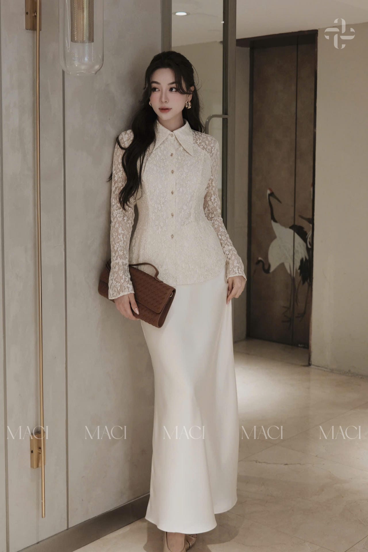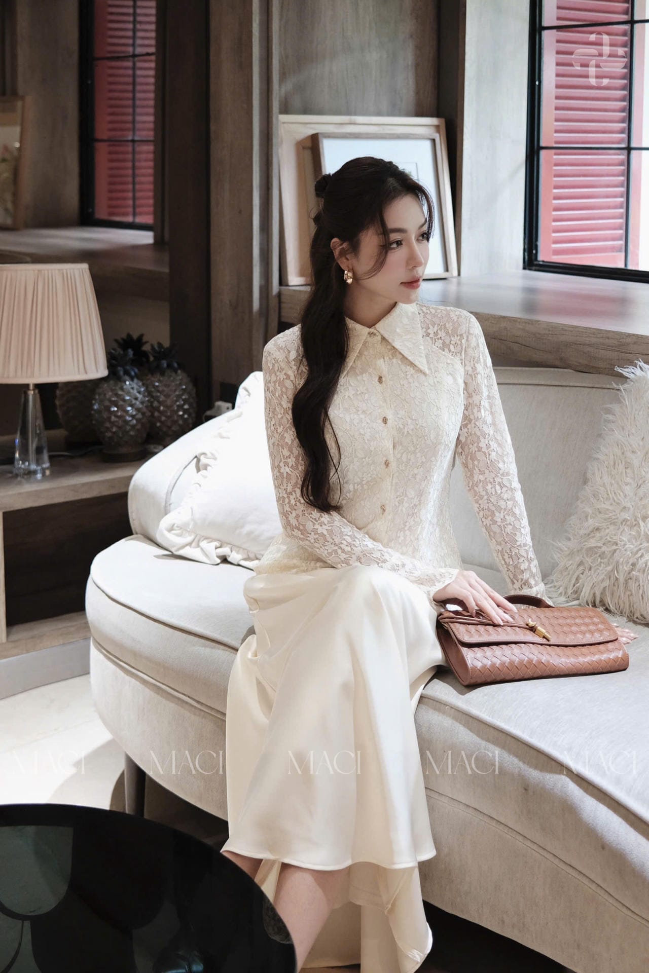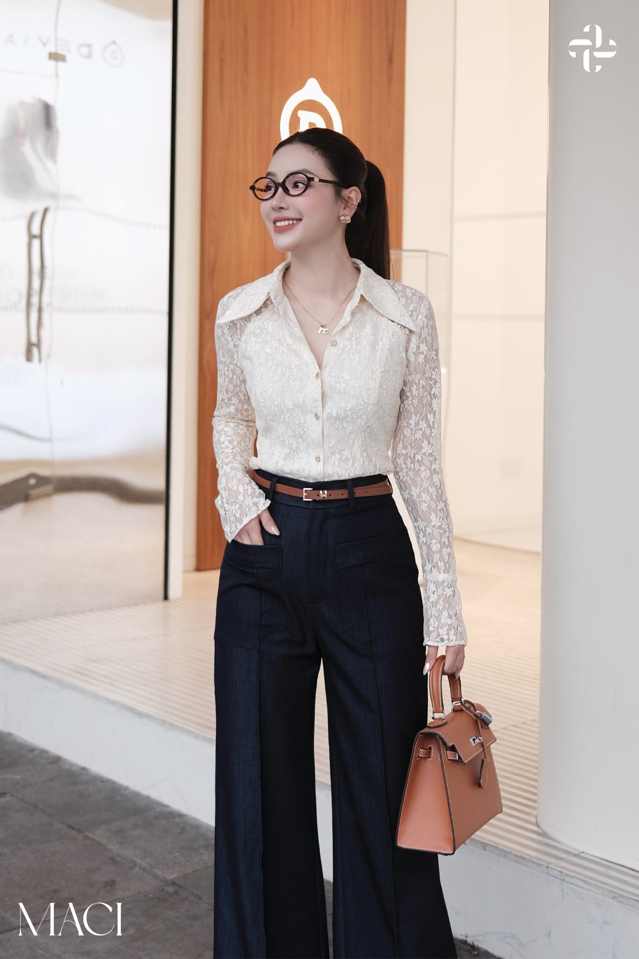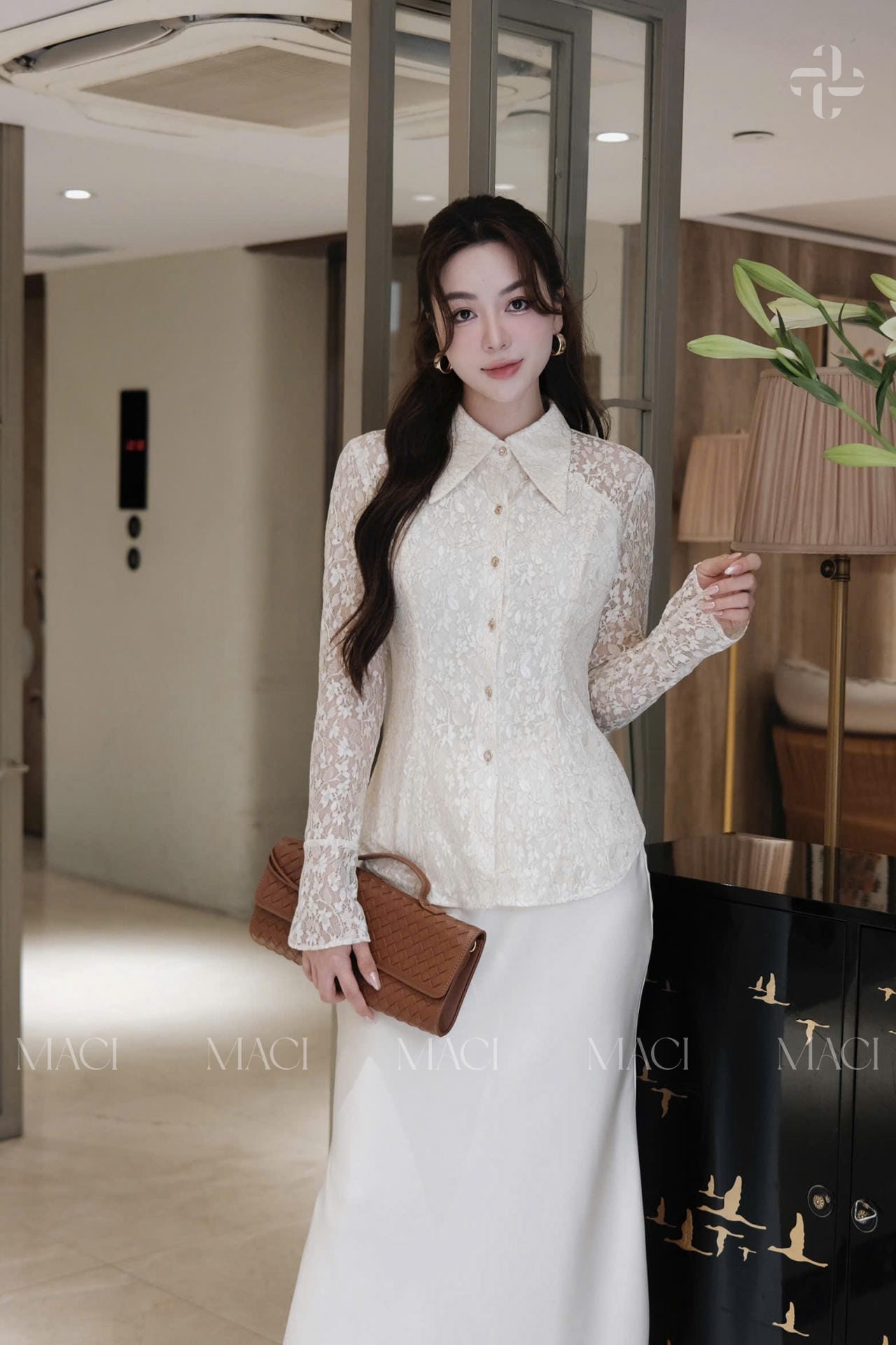 – Áo sơ mi ren dài tay với họa tiết hoa nổi sang trọng, nữ tính.