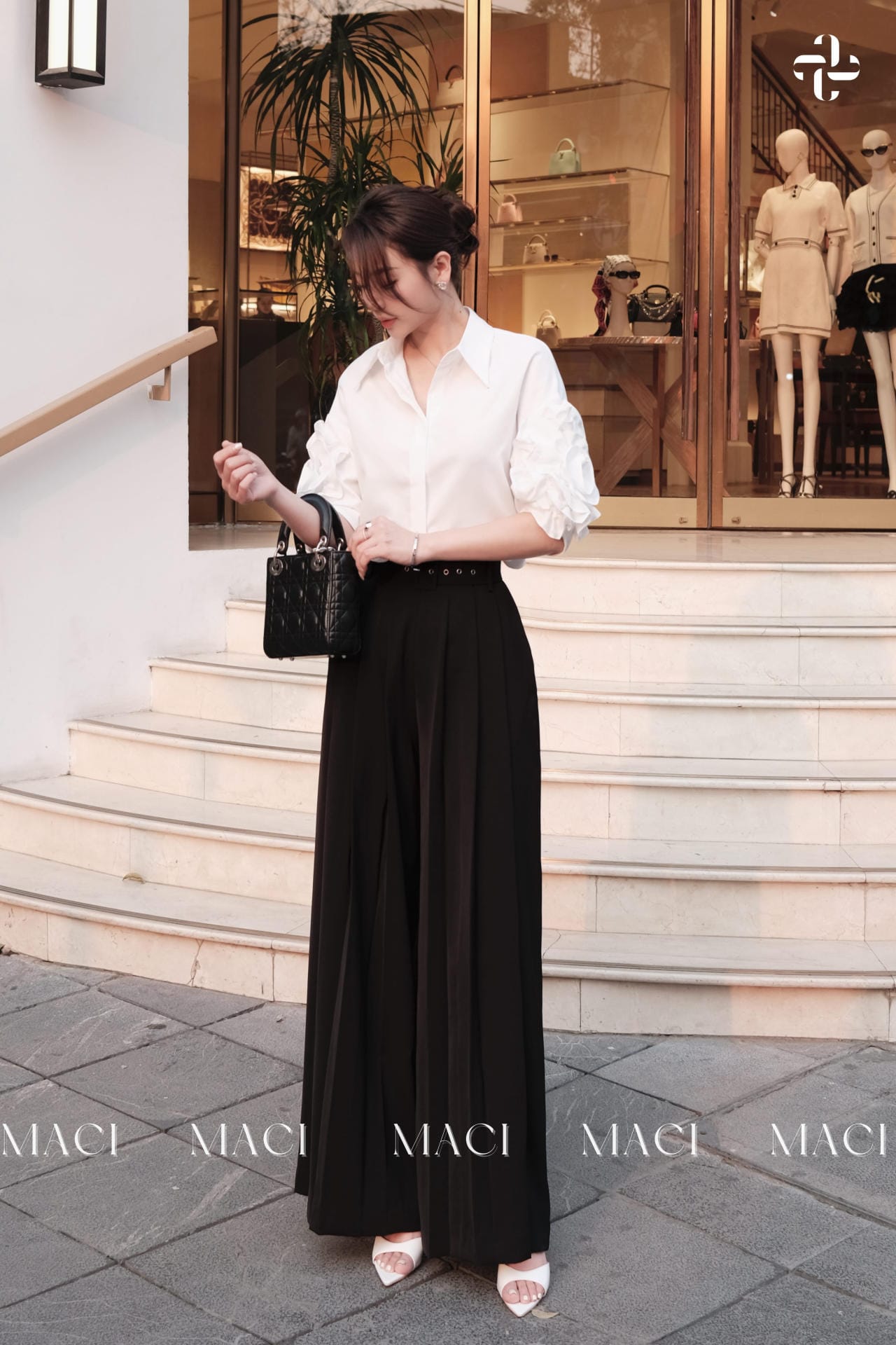 – Áo sơ mi trắng tay bèo: Cổ bẻ chỉn chu, tay áo cách điệu với lớp bèo nhẹ nhàng, tạo điểm nhấn nữ tính nhưng không kém phần sang trọng.