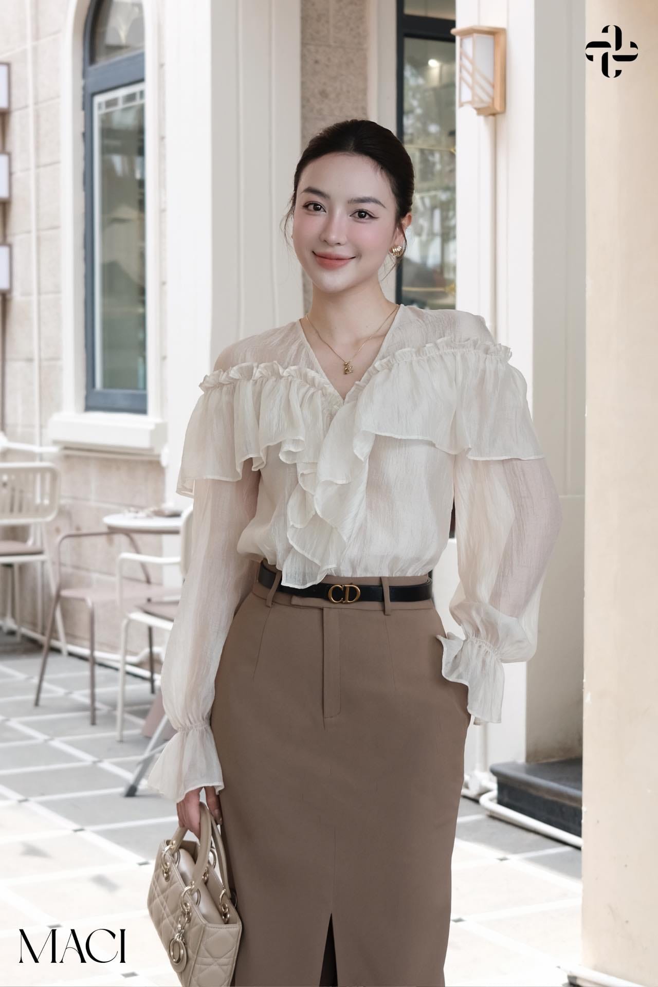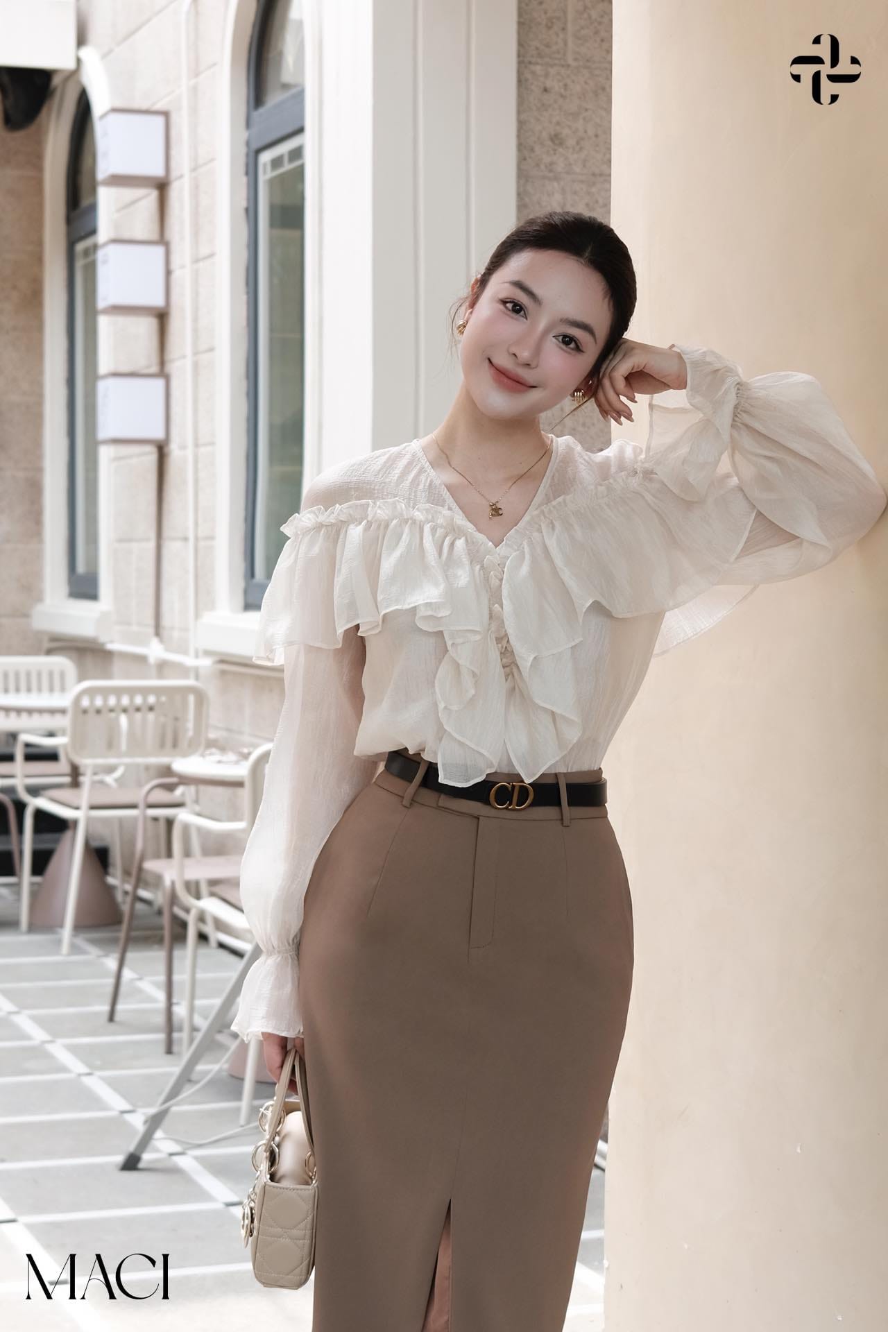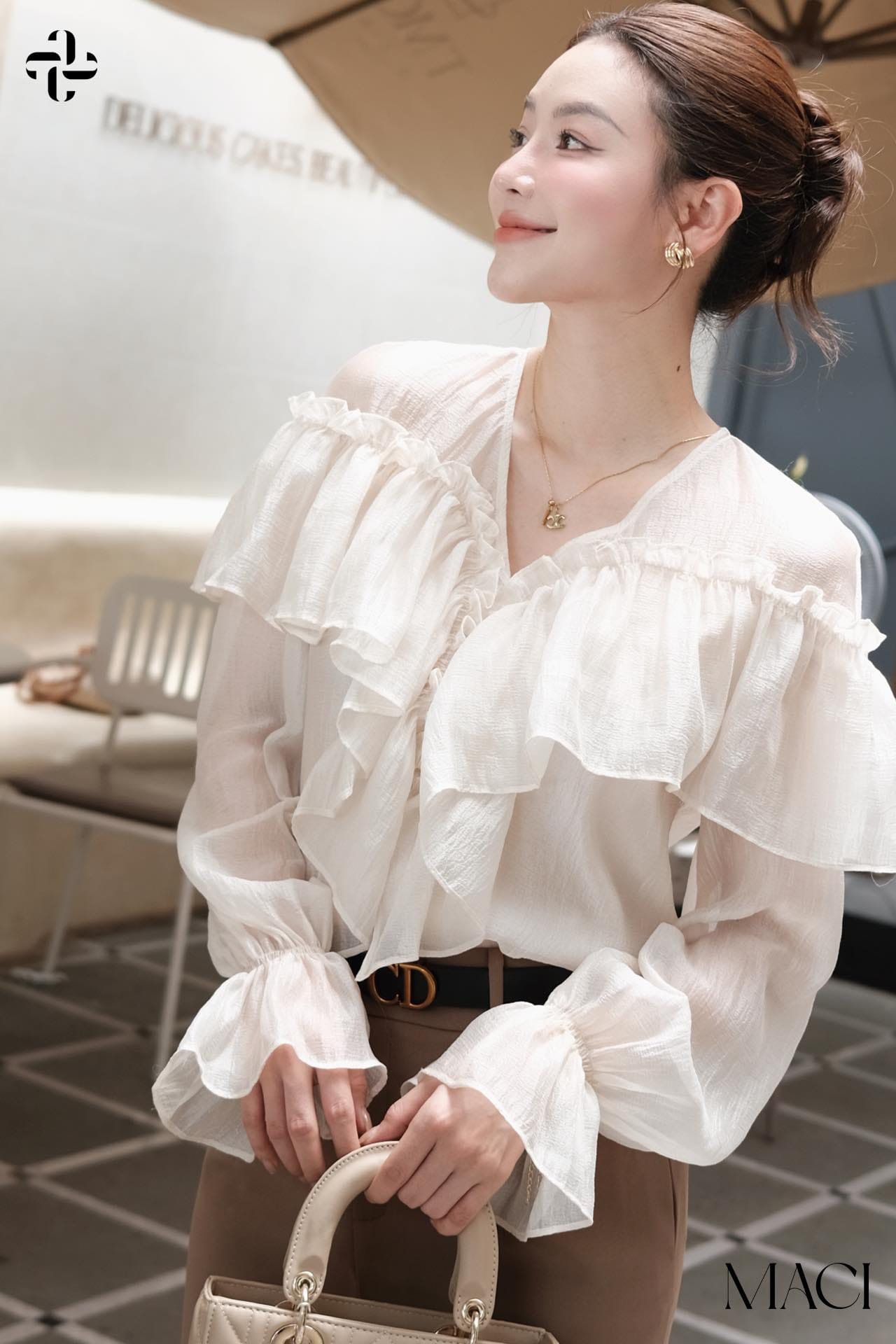 – Áo blouse chiffon trắng kem, chất liệu nhẹ nhàng, bay bổng