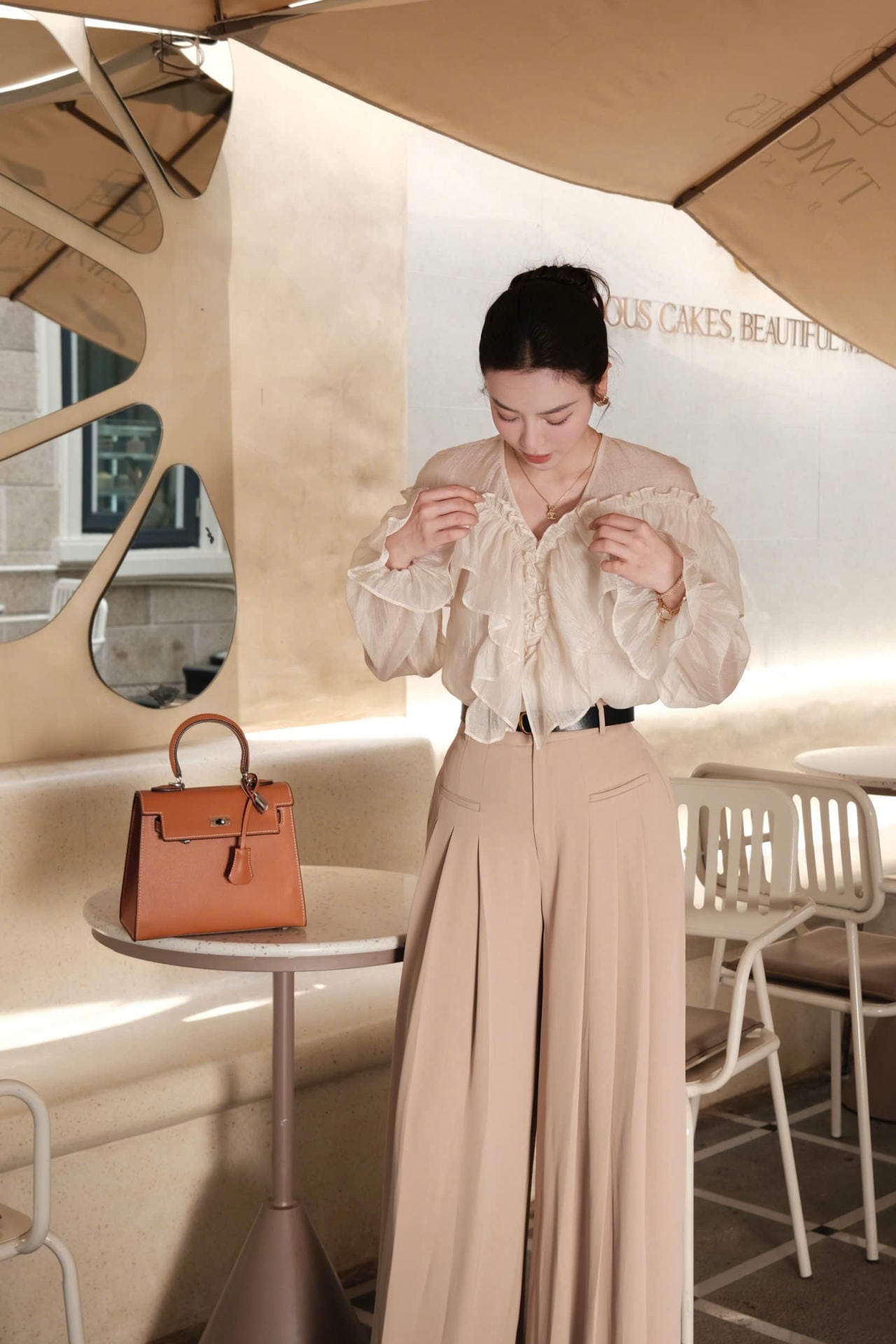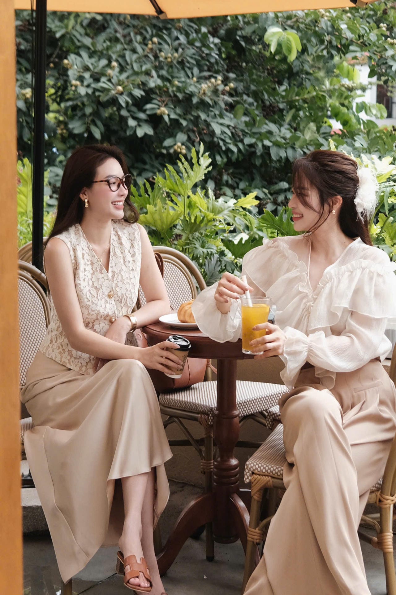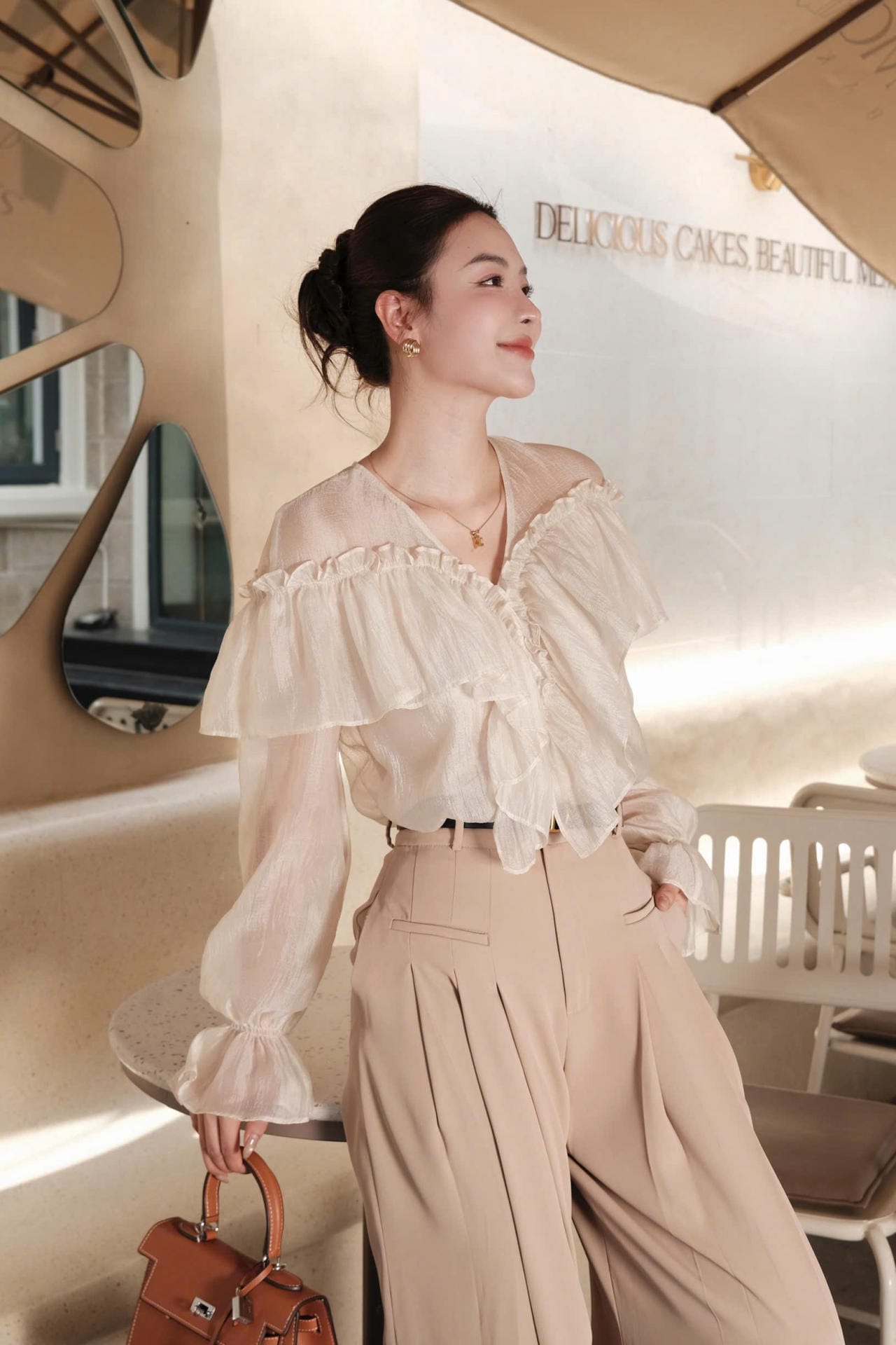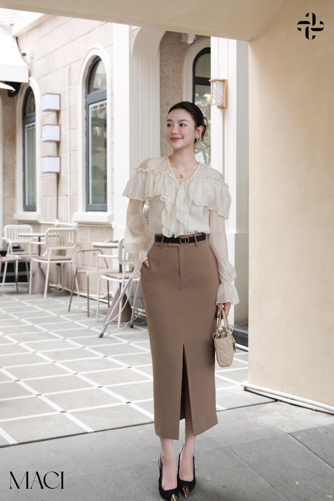 – Áo blouse chiffon trắng kem, chất liệu nhẹ nhàng, bay bổng