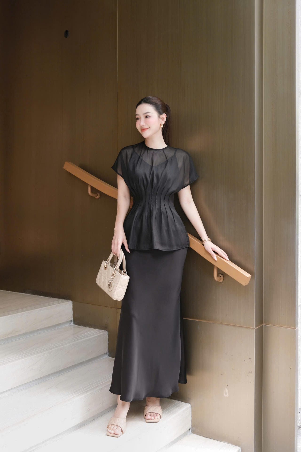 – Áo lụa cao cấp dáng peplum, tôn eo thon gọn.