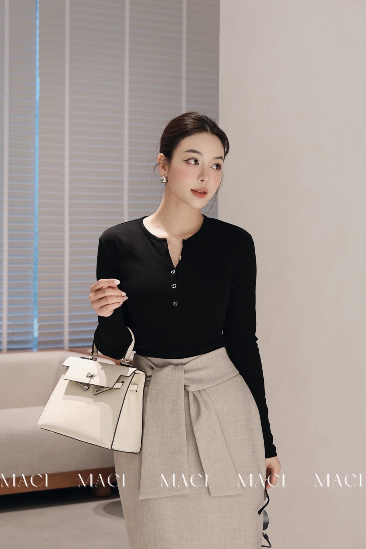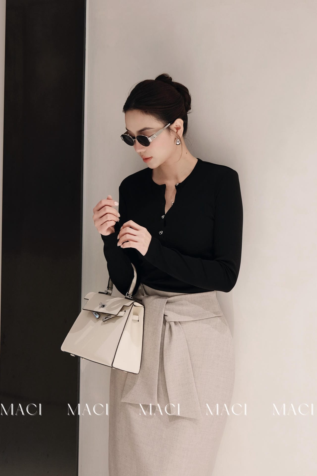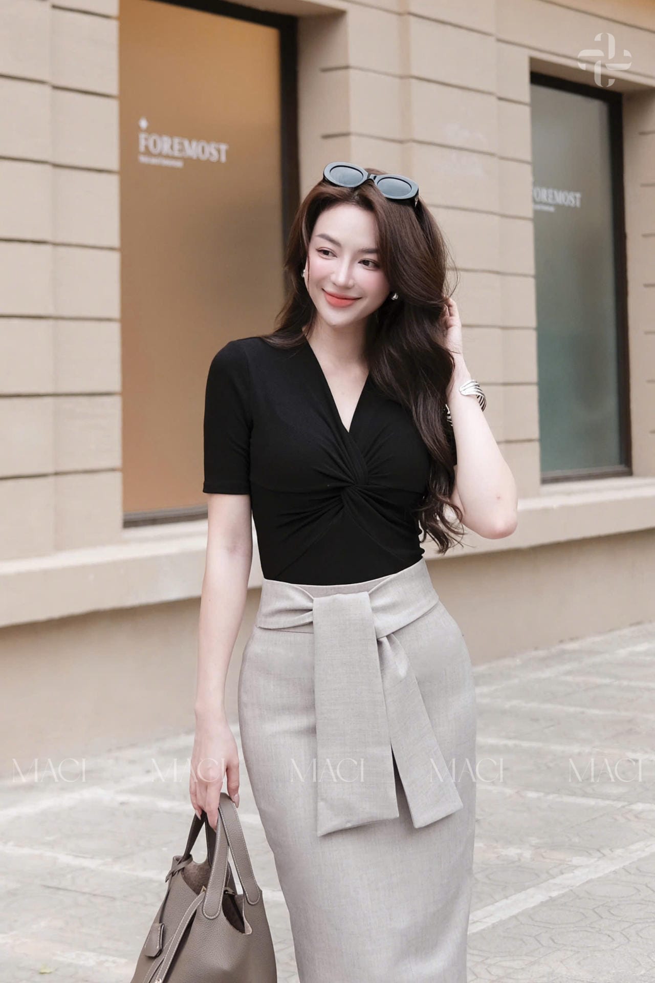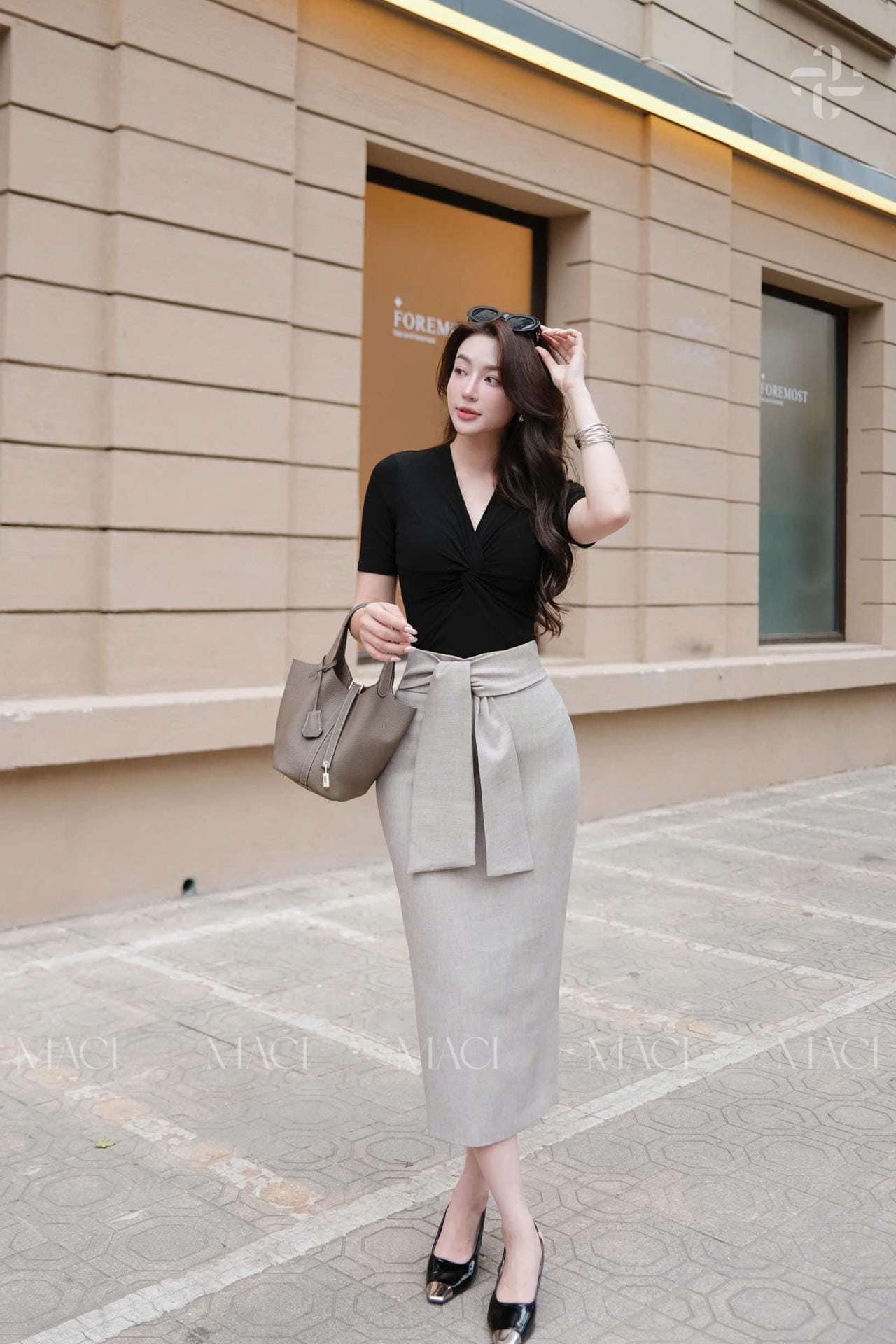 – Chân váy bút chì xẻ tà Midi Đai Nơ: Kiểu dáng ôm sát tôn dáng, xẻ tà trước vừa phải giúp bước đi thanh thoát, sang trọng. Thiết kế cạp cao giúp kéo dài đôi chân, che khuyết điểm vòng 2 hiệu quả.