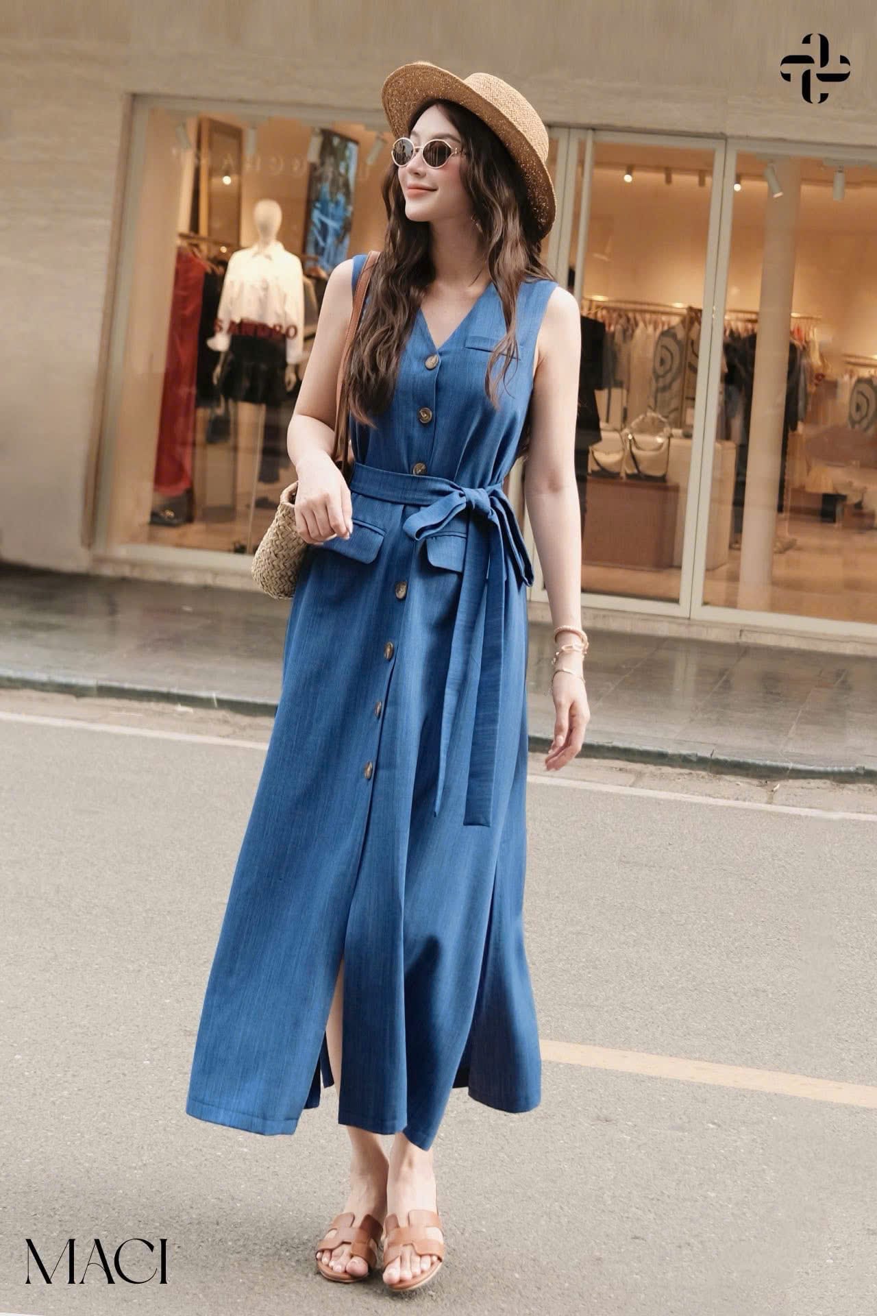 Đầm Dài Linen Hàn Màu Xanh Denim Khuy Sừng Kèm Đai MACI by MKC MCVVAXD0112 Thời Trang Nữ Thiết Kế Độc Quyền