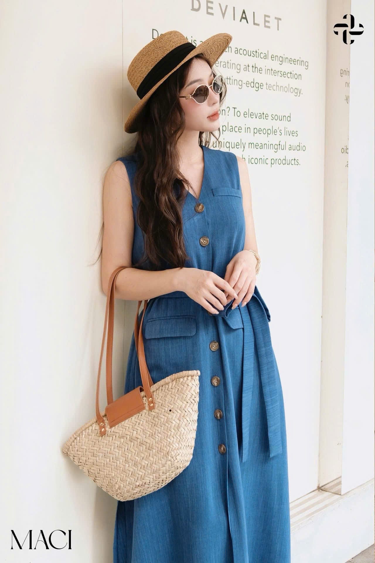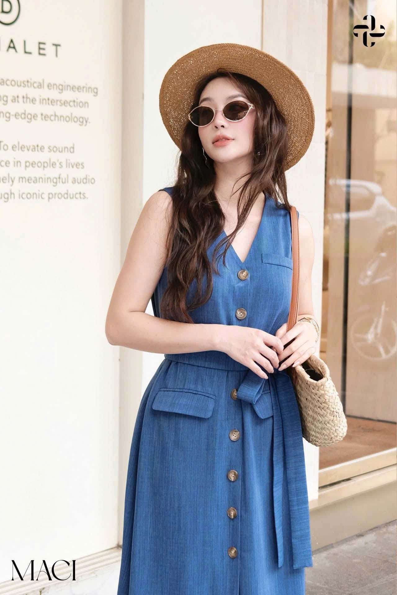 – Váy denim xanh dương, không tay, cổ chữ V thanh lịch