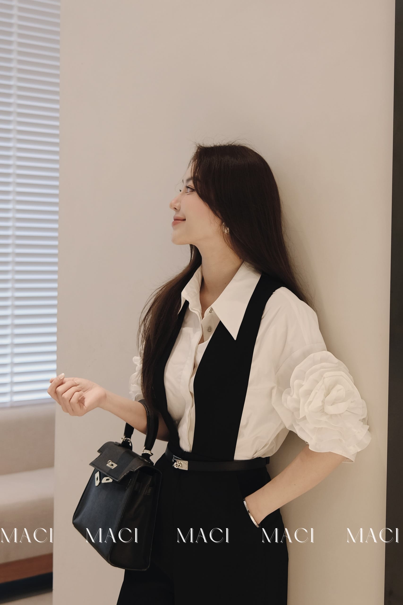 – Áo sơ mi trắng tay bèo: Cổ bẻ chỉn chu, tay áo cách điệu với lớp bèo nhẹ nhàng, tạo điểm nhấn nữ tính nhưng không kém phần sang trọng.